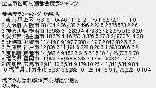 全国市区町村別都会度ランキング 都会度ランキング 地域名 東京都 区 大阪府 大阪市 神奈川県 横浜市 愛知県 名古屋市 北海道 札幌市 兵庫県 神戸市 京都府 京都市 福岡県 福岡市 広島県 広島市 福岡県 北九州市 福岡さんは札幌神戸京都に完敗 ダッサ