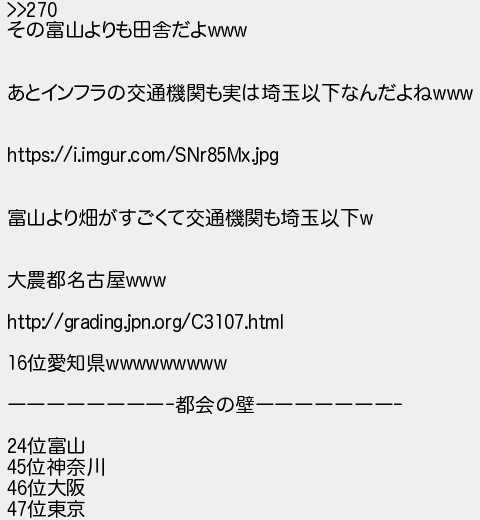 271: (茸) [] 2020/12/22(火) 08:07:22 ID:2oU2e3VX >>270 その富山よりも田舎だよwww あとインフラの交通機関も実は埼玉以下なんだよねwww https://i.imgur.com/SNr85Mx.jpg 富山より畑がすごくて交通機関も埼玉以下w 大農都名古屋www http://grading.jpn.org/C3107.html 16位愛知県wwwwwwwww ――――――――-都会の壁―――――――- 24位富山 45位神奈川 46位大阪 47位東京 http://egg.5ch.io/test/read.cgi/develop/1608277296/271