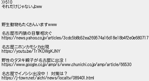 511: (茸) [] 2020/12/26(土) 10:31:41 ID:3Vv+w5Xs >>510 それだけじゃないよww 野生動物もたくさんいますwww 名古屋市内猿の目撃相次ぐ https://news.yahoo.co.jp/articles/3cdc5b8b52ea269574a16d18e18b4f2e0e680717 名古屋ニホンカモシカ出現 https://youtu.be/Tr7KDWgKJNY 野性のタヌキ親子が名古屋に出没! https://www.google.co.jp/amp/s/www.chunichi.co.jp/amp/article/66530 名古屋でイノシシ出没中! 対策は? https://j-town.net/aichi/news/localtv/089401.html http://egg.5ch.io/test/read.cgi/develop/1608277296/511
