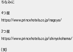 930: (SB-Android) [sage] 2020/12/30(水) 19:30:22 ID:mKB1j+Vr ちなみに 4つ星 https://www.princehotels.co.jp/nagoya/ 3つ星 https://www.princehotels.co.jp/shinyokohama/ (笑) http://egg.5ch.io/test/read.cgi/develop/1608277296/930