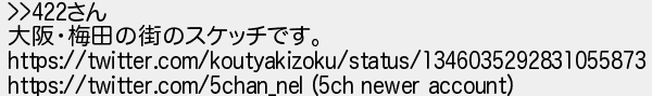 423: (大阪府) [] 2021/01/06(水) 13:59:20.97 ID:P+MHHrQz >>422さん 大阪・梅田の街のスケッチです。 https://twitter.com/koutyakizoku/status/1346035292831055873 https://twitter.com/5chan_nel (5ch newer account) http://egg.5ch.net/test/read.cgi/develop/1609089505/423