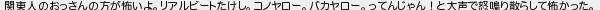 関東人のおっさんの方が怖いよリアルビートたけしコノヤローバカヤローってんじゃん!と大声で怒鳴り散らして怖かった