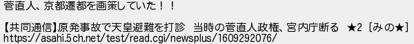 69: (庭) [] 2020/12/30(水) 13:25:33.04 ID:J+CiKFMT 菅直人、京都遷都を画策していた!! 【共同通信】原発事故で天皇避難を打診 当時の菅直人政権、宮内庁断る ★2 [みの★] https://asahi.5ch.net/test/read.cgi/newsplus/1609292076/ http://egg.5ch.net/test/read.cgi/develop/1609089505/69