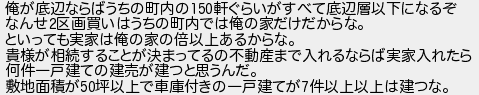 俺が底辺ならばうちの町内の軒ぐらいがすべて底辺層以下になるぞ なんせ区画買いはうちの町内では俺の家だけだからな といっても実家は俺の家の倍以上あるからな 貴様が相続することが決まってるの不動産まで入れるならば実家入れたら 何件一戸建ての建売が建つと思うんだ 敷地面積が坪以上で車庫付きの一戸建てが件以上以上は建つな