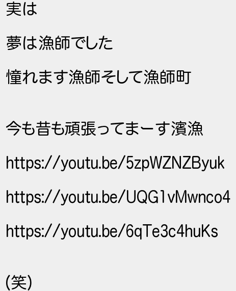 362: (SB-Android) [sage] 2021/01/06(水) 23:26:12.15 ID:Tq99CK0t 実は 夢は漁師でした 憧れます漁師そして漁師町 今も昔も頑張ってまーす濱漁 https://youtu.be/5zpWZNZByuk https://youtu.be/UQG1vMwnco4 https://youtu.be/6qTe3c4huKs (笑) http://egg.5ch.io/test/read.cgi/develop/1609386883/362
