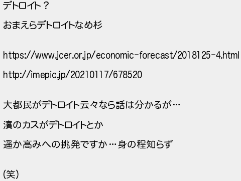 デトロイト? おまえらデトロイトなめ杉 大都民がデトロイト云なら話は分かるが のカスがデトロイトとか 遥か高みへの挑発ですか身の程知らず 笑