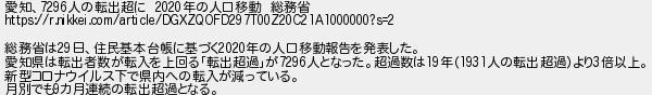 愛知人の転出超に 年の人口移動 総務省 総務省は日住民基本台帳に基づく年の人口移動報告を発表した 愛知県は転出者数が転入を上回る転出超過が人となった超過数は年人の転出超過より倍以上 新型コロナウイルス下で県内への転入が減っている 月別でもカ月連続の転出超過となる