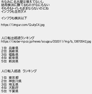 156: (茸) [sage] 2021/01/27(水) 07:17:06 ID:Vj42tSLQ ちなみに名古屋は増えてないし 結局横浜に勝てるものがなにもない そもそもトイレもままならないのにね インフラも全然ダメ インフラも横浜以下 https://i.imgur.com/QuiIyC4.jpg 人口転出超過ランキング https://i.kobe-np.co.jp/news/sougou/202011/img/b_13870542.jpg 1位 兵庫県 2位 長崎県 3位 福島県 4位 岐阜県 5位 新潟県 人口転入超過 ランキング 1位 東京都 2位 神奈川県 3位 埼玉県 4位 大阪府 5位 千葉県 http://egg.5ch.net/test/read.cgi/develop/1611319421/156