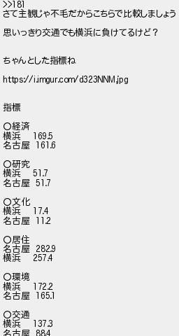 さて主観じゃ不毛だからこちらで比較しましょう 思いっきり交通でも横浜に負けてるけど? ちゃんとした指標ね 指標 経済 横浜 名古屋 研究 横浜 名古屋 文化 横浜 名古屋 居住 名古屋 横浜 環境 横浜 名古屋 交通 横浜 名古屋