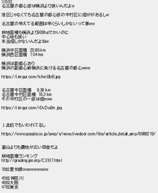 504: (茸) [] 2021/02/07(日) 07:16:57 ID:lS41fJMk >>503 名古屋の都心部は横浜より狭いんだよw 港区じゃなくても名古屋の都心部の中村区に畑ががあるしw 名古屋の栄えてる範囲は栄くらいしかないって事ww 耕地面積も横浜より900haでかいのに 中心地も狭い 本当畑しかないんだよねw 横浜中区面積 20.86 km 横浜西区面積 7.04 km 横浜は副都心あり 横浜の副都心新横浜に負ける名古屋の都心www https://i.imgur.com/kAmI3bB.jpg 名古屋中区面積 9.38 km 名古屋中村区面積 16.3 km その中村区の一部は畑www https://i.imgur.com/rDvDw2m.jpg ↓此処でもいわれてるし https://www.google.co.jp/amp/s/news.livedoor.com/lite/article_detail_amp/8986219/ 富山よりも農地が広い田舎だよ 耕地面積ランキング http://grading.jpn.org/C3107.html 16位愛知県wwwwwwwww 45位神奈川 46位大阪 47位東京 http://egg.5ch.net/test/read.cgi/develop/1611319421/504