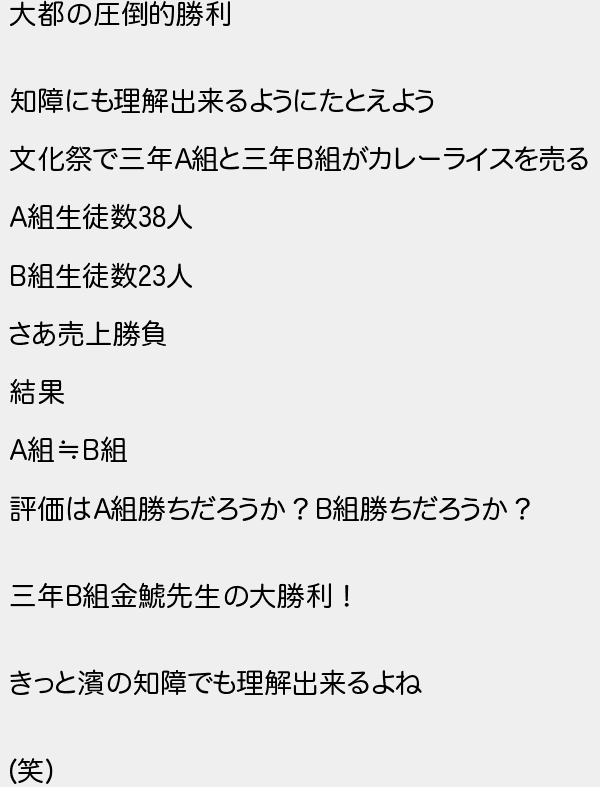大都の圧倒的勝利 知障にも理解出来るようにたとえよう 文化祭で三年組と三年組がカレーライスを売る 組生徒数人 組生徒数人 さあ売上勝負 結果 組組 評価は組勝ちだろうか?組勝ちだろうか? 三年組金先生の大勝利! きっとの知障でも理解出来るよね 笑