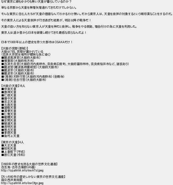 なぜ東京に縁もゆかりも無い天皇が暮らしているのか? 単なる京都から天皇を無理矢理連れてきただけでしかない そんな東京に住む人たちが天皇の価値なんてわかるわけ無いだから東京人は天皇を崇拝の対象するという頓珍漢なことをするのだ その東京人による天皇崇拝が行き過ぎた結果が明治以降の戦争だ! 天皇の扱い方を知らない東京人が天皇を神だと崇拝し戦争をやる根拠理由付けの為に天皇を利用した 東京人は遥か昔から日本を破壊し続けてきた最低な奴らなんだよ! 日本で年以上の歴史を持つ大都市はだけ! 大阪の宮都都城 大阪は回宮都が置かれている 百済大井宮は場所が昧な為に省く 難波高津宮大阪府大阪市 樟葉宮大阪府枚方市 百済大井宮大阪府河内長野市奈良県広陵町大阪府富田林市奈良県桜井市など諸説あり 難波宮難波長柄豊碕宮大阪府大阪市 難波京大阪府大阪市 難波京大阪府大阪市 南朝天野行宮大阪府河内長野市金剛寺 南朝住吉行宮大阪府大阪市 大阪の天皇人 仲哀天皇 神天皇 仁徳天皇 履中天皇 反正天皇 允恭天皇 雄略天皇 清寧天皇 仁賢天皇 天皇 安閑天皇 敏達天皇 用明天皇 推古天皇 孝徳天皇 後村上天皇 東京の天皇人 大正天皇 昭和天皇 上皇陛下平成 徳仁天皇令和 年の歴史を誇る大阪の世界文化遺産 百舌鳥古市古墳群基 たった年の歴史しかない東京の世界文化遺産 国立西洋美術館