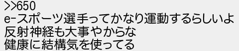 653: (兵庫県) [] 2021/02/22(月) 14:41:30 ID:W7zqk7ti >>650 e-スポーツ選手ってかなり運動するらしいよ 反射神経も大事やからな 健康に結構気を使ってる http://egg.5ch.net/test/read.cgi/develop/1613304613/653