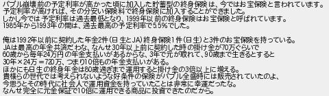 バブル崩壊前の予定利率が高かった頃に加入した貯蓄型の終身保険は今ではお宝保険と言われています 予定利率が高ければその分安い保険料で終身保険に加入することができました しかし今では予定利率は過去最低となり年以前の終身保険はお宝保険と呼ばれています 年から年の間は過去最高の予定利率ででした 俺は年以前に契約した年金件日生と終身保険件日生と件のお宝保険を持っている は最高の年金共済だわななんせ年以上前に契約した時の掛け金が万ぐらいで 歳から毎年万円の年金支払いがあるからな年で元が取れて歳まで生きるとすると 年万万つまり倍もの年金支払いがある ほかにも日生の終身年金は歳過ぎまで運用すると掛け金の倍以上に増える 貴様らの世代では考えられないような好条件の保険がバブル全盛時には販売されていたのよ 今思うとその時代に社会人で運用資金を持っていたことは非常に幸運だったな なんせ完全に元金保証で倍に運用できる商品に投資できたのだから