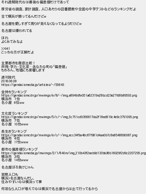 それ週間現代のは最後の偏差値だけであって 厚労省の調査家計調査人口あたりの図書館数や全国の中学テストなどのランキングだよ 全て横浜が勝ってるんだけど 名古屋を愛しすぎて周りが見えなくなってるようだけど 名古屋は嫌われてる ほれ よくみてみなよ こっちの方が正解だよ 主要都市を徹底比較! 所得学力文化度あなたの町の偏差値 もちろん地価にも影響します 週刊現代 金持ちランキング 横浜市 1位 名小屋 位 文化度ランキング 横浜市 7位 名小屋 位 長生きランキング 横浜市 4位 名小屋 位 都市の偏差値ランキング 横浜市 3位 名小屋 位 名古屋ぼろ負けじゃん 実際人口も 横浜名古屋なんだし 住みやすいのは横浜って事 何故なら人口が増えてのは横浜で名古屋からは出て行ってるから