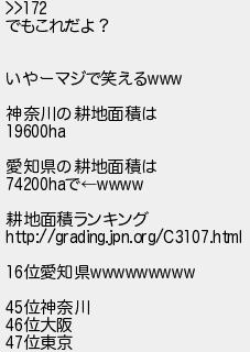 175: (茸) [] 2021/02/26(金) 07:24:35 ID:kS0pQPoW >>172 でもこれだよ? いやーマジで笑えるwww 神奈川の耕地面積は 19600ha 愛知県の耕地面積は 74200haで←wwww 耕地面積ランキング http://grading.jpn.org/C3107.html 16位愛知県wwwwwwwww 45位神奈川 46位大阪 47位東京 http://egg.5ch.io/test/read.cgi/develop/1613987747/175