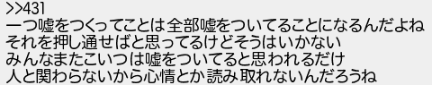 一つ嘘をつくってことは全部嘘をついてることになるんだよね それを押し通せばと思ってるけどそうはいかない みんなまたこいつは嘘をついてると思われるだけ 人と関わらないから心情とか読み取れないんだろうね
