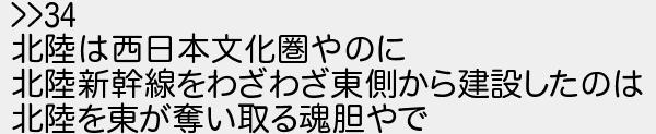 41: (東京都) [sage] 2021/03/21(日) 18:38:53.43 ID:yB1Q3/Pv >>34 北陸は西日本文化圏やのに 北陸新幹線をわざわざ東側から建設したのは 北陸を東が奪い取る魂胆やで http://egg.5ch.net/test/read.cgi/develop/1616255403/41