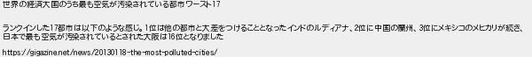 世界の経済大国のうち最も空気が汚染されている都市ワースト ランクインした都市は以下のような感じ位は他の都市と大差をつけることとなったインドのルディアナ位に中国の蘭州位にメキシコのメヒカリが続き 日本で最も空気が汚染されているとされた大阪は位となりました