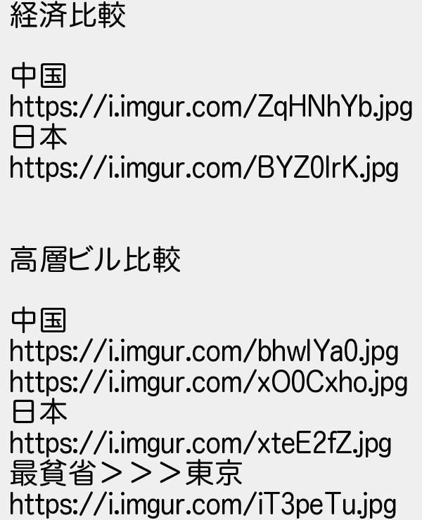 100: (東京都) [] 2021/05/20(木) 06:33:18.51 ID:jSW/VzLw 経済比較 中国 https://i.imgur.com/ZqHNhYb.jpg 日本 https://i.imgur.com/BYZ0IrK.jpg 高層ビル比較 中国 https://i.imgur.com/bhwIYa0.jpg https://i.imgur.com/xO0Cxho.jpg 日本 https://i.imgur.com/xteE2fZ.jpg 最貧省>>>東京 https://i.imgur.com/iT3peTu.jpg http://egg.5ch.io/test/read.cgi/develop/1619665571/100