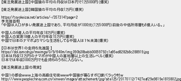 182: (東京都) [] 2021/06/06(日) 18:54:32.58 ID:0FOETyYd 【貧乏発展途上国】中国猿の平均の月収は日本円で1万5000円(爆笑) 【貧乏発展途上国】韓国猿の平均の月収1万円(爆笑) https://toyokeizai.net/articles/-/357314?page=2 李克強首相 「中国は人口が多い発展途上国であり、平均月収が1000元(1万5000円)前後の中低所得層も6億人いる。」 中国人の6億人の平均年収18万円(爆笑) 中国人の実測18億人の平均年収15万円(爆笑) 中国で日本のナマポよりマシな生活をしてる中国人は1%未満(爆笑) 【日本は世界1の金持ち先進国 】 https://dol.ismcdn.jp/mwimgs/0/9/640m/img_090b38bebb00059792c1a95ed8282b8c288919.jpg 日本は月収13万円のナマポが中国人の富裕層以上の生活レベル(爆笑) 日本では年収3000万円でも金持ちのうちに入らない。 【貧乏発展途上国の現実】 中国1の都会www上海の高級住宅街www中国猿が暮らすボロ家バラック村w http:///www.peoplechina.com.cn/xinwen/images/attachement/jpg/site125/20170112/7427eaf29e9819e1815802.jpg http://egg.5ch.io/test/read.cgi/develop/1619665571/182