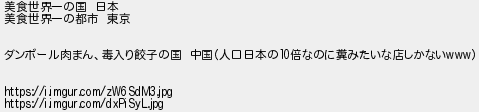 美食世界一の国 日本 美食世界一の都市 東京 ダンボール肉まん毒入り子の国 中国人口日本の倍なのに糞みたいな店しかない