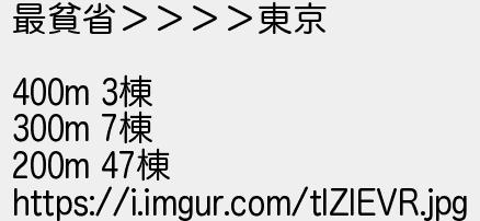71: (ジパング) [] 2021/05/16(日) 18:57:36.68 ID:6fZvmz4G 最貧省>>>>東京 400m 3棟 300m 7棟 200m 47棟 https://i.imgur.com/tlZlEVR.jpg http://egg.5ch.io/test/read.cgi/develop/1619665571/71