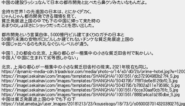 910: (東京都) [] 2021/09/26(日) 09:48:39 ID:5ygUQhU5 中国の建設ラッシュなんて日本の都市開発と比べたら鼻クソみたいなもんだよ。 金持ち世界1の先進国の日本は、とにかくデカく、 じゃんじゃん都市開発できる環境を見て、 貧乏発展途上国の中でも下の中国に帰って来た時の あまりのしょぼさにショックだったことを思い出した。 都市開発という言葉自体、5000憶円ビル建てまくりのガチの日本と 50億円未満の安物ボロビルしか建てれないチンケな貧乏発展途上国の 中国じゃ比べるのも失礼なぐらいレベルが違う。 中国1、2の都会の北京、上海の都心が一極集中の小さな貧乏田舎村で恥かしい。 中国人「中国に生まれて劣等感しかない」 北京、上海の都心が一極集中の小さな貧乏田舎村の現実。2021年現在も同じ。 https://dynamic-media-cdn.tripadvisor.com/media/photo-o/14/e3/d0/2b/prime-hotel.jpg?w=1200 https://imagel.sekainavi.com/images/templates/SHANGHAI/1001561/dc372904983b27f4_S.jpg https://imagel.sekainavi.com/images/templates/SHANGHAI/5043795/7f8f7de6e8126bf0_S.jpg https://imagel.sekainavi.com/images/templates/SHANGHAI/5043795/b7802a311e79598c_S.jpg https://imagel.sekainavi.com/images/templates/SHANGHAI/1001561/6cce30aaf0cb76fc_S.jpg https://imagel.sekainavi.com/images/templates/SHANGHAI/1001561/8882a4ca1b285dbe_S.jpg 中国は貧乏発展途上国の中でも下の下 https://stat.ameba.jp/user_images/20181213/23/kouseisogo/18/73/j/o0600037014320380276.jpg http://egg.5ch.io/test/read.cgi/develop/1619665571/910