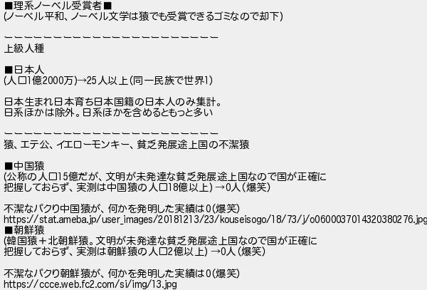 理系ノーベル受賞者 ノーベル平和ノーベル文学は猿でも受賞できるゴミなので却下 ーーーーーーーーーーーーーーーーーーーーーー 上級人種 日本人 人口億万人以上同一民族で世界 日本生まれ日本育ち日本国籍の日本人のみ集計 日系ほかは除外日系ほかを含めるともっと多い ーーーーーーーーーーーーーーーーーーーーーー 猿エテ公イエローモンキー貧乏発展途上国の不潔猿 中国猿 公称の人口億だが文明が未発達な貧乏発展途上国なので国が正確に 把握しておらず実測は中国猿の人口億以上 人爆笑 不潔なパクり中国猿が何かを発明した実績は爆笑 朝鮮猿 韓国猿北朝鮮猿文明が未発達な貧乏発展途上国なので国が正確に 把握しておらず実測は朝鮮猿の人口億以上 人爆笑 不潔なパクり朝鮮猿が何かを発明した実績は爆笑