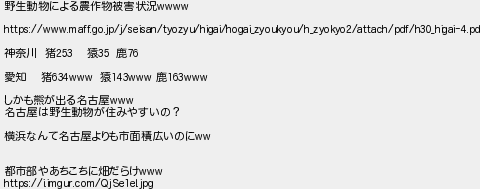 309: (茸) [] 2021/05/18(火) 07:17:32.26 ID:L9SMBnya 野生動物による農作物被害状況wwww https://www.maff.go.jp/j/seisan/tyozyu/higai/hogai_zyoukyou/h_zyokyo2/attach/pdf/h30_higai-4.pdf 神奈川 猪253 猿35 鹿76 愛知 猪634www 猿143www 鹿163www しかも熊が出る名古屋www 名古屋は野生動物が住みやすいの? 横浜なんて名古屋よりも市面積広いのにww 都市部やあちこちに畑だらけwww https://i.imgur.com/QjSe1el.jpg http://egg.5ch.io/test/read.cgi/develop/1619985916/309