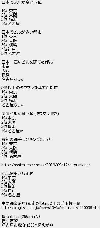 449: (茸) [] 2021/05/20(木) 18:00:13.83 ID:QyWj6s1Q 日本でGDPが高い順位 1位 東京 2位 大阪 3位 横浜 4位名古屋 日本でビルが多い都市 1位 東京 2位 大阪 3位 横浜 4位神戸 5位名古屋 日本一高いビルを建てた都市 東京 大阪 横浜 名古屋なしw 5億以上のタワマンを建てた都市 1位 東京 2位 大阪 3位 横浜 名古屋なしw 高層ビルが多い順(タワマン抜き) 1位東京 2位大阪 3位横浜 4位名古屋w 最新の都会ランキング2019年 1位 東京 2位 大阪 3位 横浜 4位 名古屋 http://honichi.com/news/2019/09/17/cityranking/ ビルが多い都市順 1位東京 2位大阪 3位横浜 4位神戸 5位名古屋 主要都道府県(都市)別50m以上のビル数一覧 http://blog.livedoor.jp/news23vip/archives/5230039.html 横浜市133(296m有り) 神戸市92 名古屋市82(内200m超えが4) http://egg.5ch.io/test/read.cgi/develop/1619985916/449