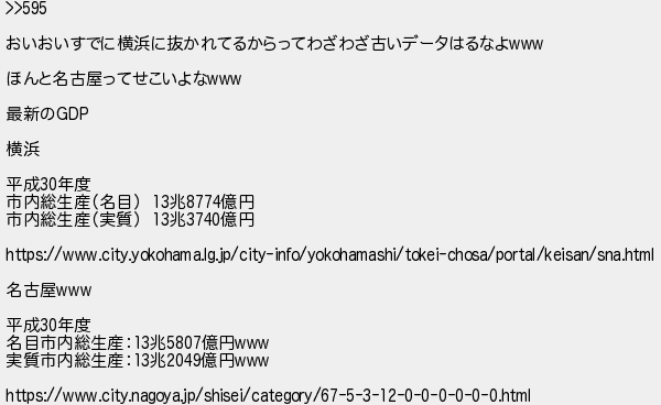 596: (茸) [age] 2021/05/24(月) 20:58:32.94 ID:JvZhdwBL >>595 おいおいすでに横浜に抜かれてるからってわざわざ古いデータはるなよwww ほんと名古屋ってせこいよなwww 最新のGDP 横浜 平成30年度 市内総生産(名目) 13兆8774億円 市内総生産(実質) 13兆3740億円 https://www.city.yokohama.lg.jp/city-info/yokohamashi/tokei-chosa/portal/keisan/sna.html 名古屋www 平成30年度 名目市内総生産:13兆5807億円www 実質市内総生産:13兆2049億円www https://www.city.nagoya.jp/shisei/category/67-5-3-12-0-0-0-0-0-0.html http://egg.5ch.io/test/read.cgi/develop/1619985916/596