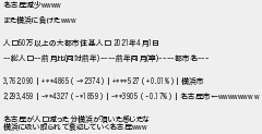 62: (東京都) [] 2021/05/06(木) 00:09:53.61 ID:SvCv6eUP 名古屋減少wwww また横浜に負けたwww 人口50万以上の大都市住基人口 2021年4月1日 --総人口--前月比(同対前年)----前年同月(率)----都市名--- 3,762,090|+**4865 ( -*2374 )|+***527 ( +0.01% )|横浜市 2,293,459|-**4327 ( -*1859 )|-**3905 ( -0.17% )|名古屋市←wwwwwww w 名古屋が人口減った分横浜が頂いた感じだな 横浜に吸い取られて衰退していく名古屋www http://egg.5ch.io/test/read.cgi/develop/1619985916/62