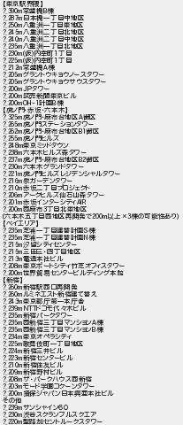 東京駅界隈 常盤橋棟 日本橋一丁目中地区 八重洲一丁目東地区 八重洲二丁目北地区 八重洲二丁目中地区 八重洲一丁目北地区 仮内幸町1丁目 仮内幸町1丁目 常盤橋棟 グラントウキョウノースタワー グラントウキョウサウスタワー タワー 読売新聞東京ビル 計画棟 虎ノ門赤坂六本木 虎ノ門麻布台地区街区 虎ノ門ステーションタワー 虎ノ門麻布台地区街区 虎ノ門ヒルズ 東京ミッドタウン 六本木ヒルズ森タワー 虎ノ門麻布台地区街区 六本木グランドタワー 虎ノ門ヒルズレジデンシャルタワー 泉ガーデンタワー 赤坂二丁目プロジェクト アークヒルズ仙石山森タワー 赤坂インターシティ 西麻布丁目北東地区 六本木五丁目西地区再開発で以上棟の可能性あり ベイエリア 芝浦一丁目建替計画棟 芝浦一丁目建替計画棟 汐留シティセンター 三田三四丁目地区 電通本社ビル 東京ポートシティ竹芝オフィスタワー 世界貿易センタービルディング本館 新宿 新宿駅西口再開発 ルミネエスト新宿建て替え 東京都庁第一本庁舎 ドコモ代木ビル 新宿パークタワー 西新宿三丁目マンション棟 西新宿三丁目マンション棟 東京オペラシティ 歌舞伎町一丁目地区 新宿三井ビル 新宿センタービル 新宿住友ビル 新宿野村ビル ザパークハウス西新宿 モード学園コクーンタワー 損保ジャパン日本興亜本社ビル その他 サンシャイン60 渋谷スクランブルスクエア 聖路加セントルークスタワー
