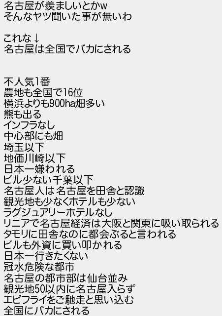 246: 大阪は金魚のフン(東京都) [] 2021/05/15(土) 12:59:39.74 ID:caZO1eF0 名古屋が羨ましいとかw そんなヤツ聞いた事が無いわ これな↓ 名古屋は全国でバカにされる 不人気1番 農地も全国で16位 横浜よりも900ha畑多い 熊も出る インフラなし 中心部にも畑 埼玉以下 地価川崎以下 日本一嫌われる ビル少ない千葉以下 名古屋人は名古屋を田舎と認識 観光地も少なくホテルも少ない ラグジュアリーホテルなし リニアで名古屋経済は大阪と関東に吸い取られる タモリに田舎なのに都会ぶると言われる ビルも外資に買い叩かれる 日本一行きたくない 冠水危険な都市 名古屋の都市部は仙台並み 観光地50以内に名古屋入らず エビフライをご馳走と思い込む 全国にバカにされる http://egg.5ch.io/test/read.cgi/develop/1620793241/246