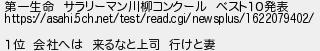522: (愛知県) [sage] 2021/05/27(木) 14:26:47.50 ID:DFaQWVHW 第一生命 サラリーマン川柳コンクール ベスト10発表 https://asahi.5ch.net/test/read.cgi/newsplus/1622079402/ 1位 会社へは 来るなと上司 行けと妻 http://egg.5ch.io/test/read.cgi/develop/1621639663/522
