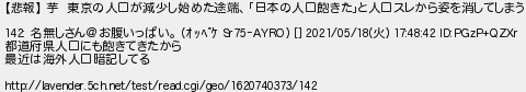 562: (大阪府) [sage] 2021/05/27(木) 22:32:55.57 ID:nNEIpFGV 【悲報】 芋 東京の人口が減少し始めた途端、「日本の人口飽きた」と人口スレから姿を消してしまう 142: 名無しさん@お腹いっぱい。 (オッペケ Sr75-AYRO) [] 2021/05/18(火) 17:48:42 ID:PGzP+QZXr 都道府県人口にも飽きてきたから 最近は海外人口暗記してる http://lavender.5ch.net/test/read.cgi/geo/1620740373/142 http://egg.5ch.io/test/read.cgi/develop/1621639663/562