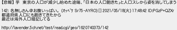 562: (大阪府) [sage] 2021/05/27(木) 22:32:55.57 ID:nNEIpFGV 【悲報】 芋 東京の人口が減少し始めた途端、「日本の人口飽きた」と人口スレから姿を消してしまう 142: 名無しさん@お腹いっぱい。 (オッペケ Sr75-AYRO) [] 2021/05/18(火) 17:48:42 ID:PGzP+QZXr 都道府県人口にも飽きてきたから 最近は海外人口暗記してる http://lavender.5ch.net/test/read.cgi/geo/1620740373/142 http://egg.5ch.io/test/read.cgi/develop/1621639663/562