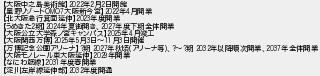 大阪中之島美術館年月日開館 星野リゾート大阪新今宮年月開業 北大阪急行箕面延伸年度開業 うめきた期年夏街開き年度下期全体開業 大阪公立大学森ノ宮キャンパス年月竣工 大阪関西万博年月日月日開催 万博記念公園アリーナ期 年秋頃アリーナ等期 年以降順次開業年全体開業 大阪モノレール東大阪延伸年開業 なにわ筋線年度春開業 淀川左岸線延伸部年度開通