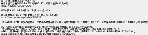 富士山噴火確率は今後年で1 毎年水没の危機のある名古屋と南海トラフ巨大地震で壊滅する愛知県 産業も死んでるしトヨタも終わったし良いこと無いな 個人情報登録新たに社 同意なく計万人分に トヨタ販社 トヨタ自動車は日系列の販売会社が顧客の同意を得ずに個人情報を登録していた問題で新たに社で同様の登録が判明したと発表した時事通信 人分の名前や住所電話番号などで発表済みの分と合わせ計社万人分に上った トヨタは改めて心より深くおわび申し上げると謝罪し販売店のシステムを見直すなど再発防止策を徹底すると説明している トヨタは販売会社で同意なく登録された個人情報を基に通信機能を使って車の状況確認などができるサービスのを顧客に発行していた 販売店の従業員は購入者が注文書などに書いた情報を転用していたという
