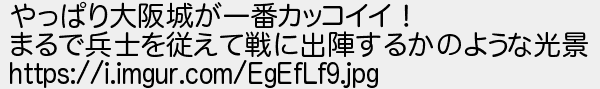 404: (東京都) [] 2021/06/29(火) 20:55:48.16 ID:GYFciuzM やっぱり大阪城が一番カッコイイ! まるで兵士を従えて戦に出陣するかのような光景 https://i.imgur.com/EgEfLf9.jpg http://egg.5ch.net/test/read.cgi/develop/1624601702/404