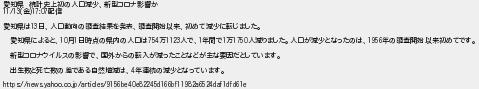 愛知県 統計史上初の人口減少新型コロナ影響か 金配信 愛知県は日人口動向の調査結果を発表調査開始以来初めて減少に転じました 愛知県によると月日時点の県内の人口は万人で年間で万人減りました人口が減少となったのは年の調査開始以来初めてです 新型コロナウイルスの影響で国外からの転入が減ったことなどが主な要因だとしています 出生数と死亡数の差である自然増減は年連続の減少となっています