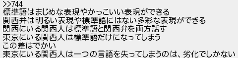 標準語はまじめな表現やかっこいい表現ができる 関西弁は明るい表現や標準語にはない多彩な表現ができる 関西にいる関西人は標準語と関西弁を両方話す 東京にいる関西人は標準語だけになってしまう この差はでかい 東京にいる関西人は一つの言語を失ってしまうのは劣化でしかない