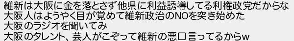 維新は大阪に金を落とさず他県に利益誘導してる利権政党だからな 大阪人はようやく目が覚めて維新政治のを突き始めた 大阪のラジオを聞いてみ 大阪のタレント芸人がこぞって維新の悪口言ってるから