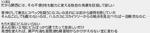 だから関西にはその不便さをも魅力に変える独自の発展を目指して欲しい 背伸びして東京とスペックを競うこのスレの流れには前から疑問を感じていた そんなことしても敵わないのはハルカスとスカイツリーからの眺めを見比べれば一目瞭然なのに もう大阪にビルはいらない あんな狭い土地にビルばっかり建てたって息苦しいだけ 発想を変えれば瀬戸内海も琵琶湖も障害物からかけがえのない宝に変わる