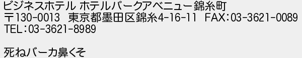 ビジネスホテル ホテルパークアベニュー錦糸町 東京都墨田区錦糸 死ねバーカ鼻くそ