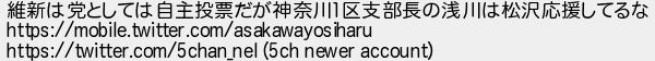 維新は党としては自主投票だが神奈川区支部長の浅川は松沢応援してるな