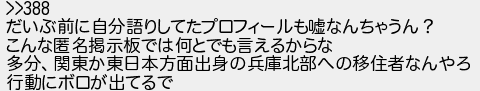 だいぶ前に自分語りしてたプロフィールも嘘なんちゃうん? こんな匿名掲示板では何とでも言えるからな 多分関東か東日本方面出身の兵庫北部への移住者なんやろ 行動にボロが出てるで
