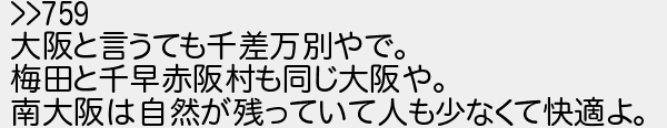 大阪と言うても千差万別やで 梅田と千早赤阪村も同じ大阪や 南大阪は自然が残っていて人も少なくて快適よ