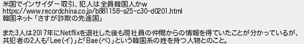 939: (茨城県) [sage] 2021/08/19(木) 20:27:15 ID:fxsO2Jqz 米国でインサイダー取引、犯人は全員韓国人かw https://www.recordchina.co.jp/b881158-s25-c30-d0201.html 韓国ネット 「さすが詐欺の先進国」 また3人は2017年にNetflixを退社した後も現社員の仲間からの情報を得ていたことが分かっているが、 共犯者の2人も「Lee(イ)」と「Bae(ペ)」という韓国系の姓を持つ人物とのこと。 http://egg.5ch.net/test/read.cgi/develop/1629106513/939
